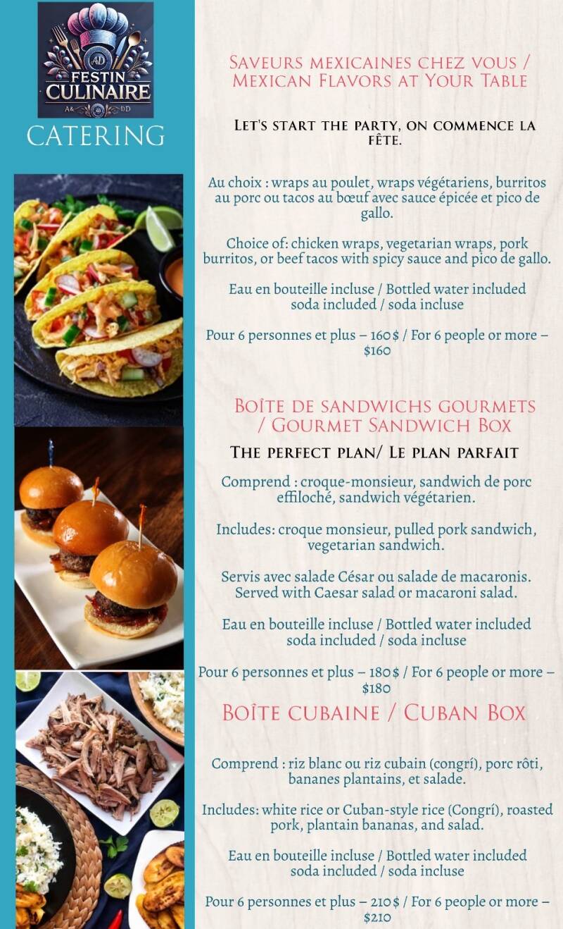 “Les plats étaient délicieux et le service impeccable. Je recommande vivement Festin Culinaire A&D pour tous vos événements. Merci pour cette expérience incroyable!”